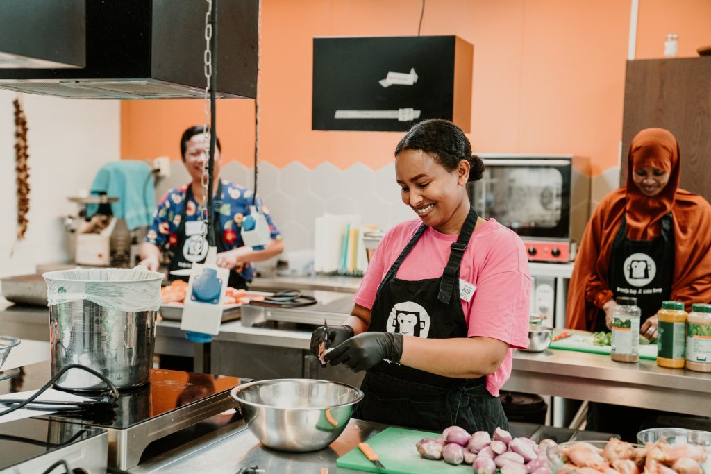 Deelnemers aan het werk in de keuken van Broodje Aap & Linke Soep